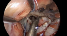 Our first case involved a sixty-four-year-old gentleman who presented with mitral and aortic valve infective endocarditis, including severe aortic and mitral regurgitation. The mitral valve was accessed via Sondergaard’s groove; the flail A2 leaflet was visualized with old vegetations containing small debris on posterior leaflet. The posterior leaflet debris and the A2 leading edge was excised. Next, the mitral valve was repaired using two pairs of neochordae to A2 and a 30 mm annuloplasty ring. The water test displayed good results, and the lipstick test showed 10 mm coaptation. Subsequently, the patient also underwent a concomitant aortic valve replacement. A follow-up transthoracic echocardiogram at twelve months showed mild mitral regurgitation.