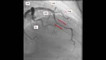 The authors present an interesting cases of a myocardial bridging as a cause of exertional chest pain. This is the case is of a 42-year-old woman with a past medical history of HTN and PAHTN who has been worked up by cardiology for chest pain with minimal exertion. The CXR didn’t show any acute abnormalities, and the EKG showed sinus rhythm with some indeterminate ST segment changes in the anterior leads. A normal EF of 60% was seen on the echocardiogram as well as a flattening ventricular septum consisting of right ventricular pressure overload. Due to her history of PAH, a right heart cath was performed, evidencing a severe pulmonary hypertension with baseline pulmonary artery pressures of 88/36. Finally, and as part of her workup, a left heart cath was performed, and there was evidence of codominance as well as an LAD and the mid-portion had a segment that was compressing during systole, concerning for myocardial bridging. This phenomenon can be clearly seen in the video.