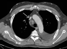 [4]Figure 2. Axial chest CT demonstrating occlusive stenosis of the central portion of the innominate vein and SVC confluence.