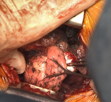 Laser-assisted metastatectomy is a safe and validated technique for facilitating the resection of a large number of pulmonary metastases whilst maximizing lung tissue preservation (1). Here the authors present an open laser-assisted metastatectomy using the LEONARDO® Dual Wave 200W laser system, which is the first time this device has been used in the UK. The case in question is a 73-year-old man with a past history of duodenal carcinoma resected four years previously via the Whipple's procedure. Surveillance CT imaging revealed four enlarging right pulmonary nodules suspicious for metastatic disease. This was a trainee-led procedure performed by a standard posterolateral thoracotomy. An area of emphysematous lung was found incidentally at the apex, which was densely adherent to the chest wall and required partial decortication to fully mobilize. The procedure was performed without complication. An air leak was identified at the decortication site and this was oversewn with good effect at the end of the case. The patient developed a postoperative air leak which appeared to improve initially. However, on switching to an ambulatory flutter-valve bag, there was worsening surgical emphysema. Return to the theatre on postoperative day 12 revealed a persistent air leak from the decortication area, which was repaired. The patient subsequently made a good recovery and was discharged on postoperative day 17. Histology confirmed metastatic duodenal carcinoma.