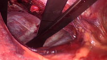 The patient was a 37-year-old female high-performance athlete with severe pectus excavatum (HI 3.5) associated with compression of the right cavities, occasional palpitations, and an episode of syncope. The surgical technique used consisted of bilateral cryoanalgesia from levels T3 to T7, sternal elevation with a traction crane, and anchoring of two screws. The cross-bar correction involved the placement of three bars guided by thoracoscopy and the fixation of the three bars with two stabilizer bridges. A flare-buster correction was performed on the associated chondral dysmorphia using a fiberloop suture. Intraoperative transesophageal echocardiography was performed before and after sternal relocation.