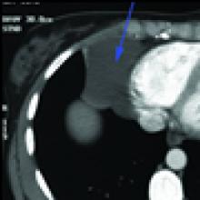 | Figure 1. Preoperative Chest x-ray. | Figure 2. Chest CT scan showing right cardiophrenic pericardial cyst. |