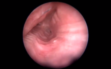 The authors present the bronchoscopic findings from a 58-year-old woman who was diagnosed with relapsing polychondritis. This video shows the results of a patch tracheoplasty, four years after the operation. The trachea and upper airways seemed normal, but the orifices of both main bronchi were significantly narrowed.