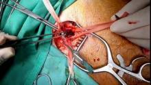Left inguinal incision was given and femoral vein exposed. Proximal and distal control attained, and vein opened. A large clot was visualized with no venous flow (Figure 3). Thrombectomy was done using suction and fogarty (Video 2). Also, distal compression of leg was done to mobilize the thrombus. Both proximal and distal veins approached. Free venous flow was established. Veins closed with 6/0 prolene.