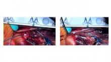 A median sternotomy was then performed, and the pericardium was opened in inverted T fashion. Then the heart was positioned to expose the anterior surface of the heart, and the LAD was identified epicardially where it exited the MB distally. A Beaver blade was used to divide the epicardium overlying the LAD where it emerged from the myocardium and the epicardial fat distal to the MB. Upon entering the surgical plane, immediately anterior to the coronary artery, tenotomy scissors were utilized to divide the overlying epicardial fat and MB, moving in a distal to proximal direction in 1mm to 2mm increments until the entire bridge had been released. Epicardial venous bleeding was then controlled with a combination of Bovie cautery, clips, and suture ligation. Upon completion of the unroofing, the length of the unroofed artery was measured to compare with measurements obtained from the IVUS map and CT images. A 24-French Blake drain was then placed and left in the mediastinum. Then, the pericardium was loosely reapproximated over the aorta, and the chest wall was closed in the standard fashion.