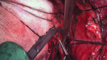 Through a fourth sternotomy and after the initial mediastinal dissection, the previously placed Fontan conduit was identified and partially dissected. However, it was quite adherent to the left phrenic nerve and was inserted directly opposite the left cavopulmonary anastomosis. Therefore, the surgeons decided to create a new extracardiac conduit directed to the right pulmonary artery instead to minimize energy loss through the old Fontan design. This approach appeared feasible without the need for cardiopulmonary bypass.