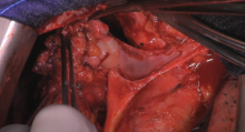 The patient was started on four cycles of neoadjuvant therapy consisting of cisplatin, doxorubicin, and cyclophosphamide. A postchemotherapy CT scan demonstrated shrinkage of the mass. Preoperative assessments were performed and the authors elected to proceed with radical thymectomy with vascular resection and reconstruction of right and left brachiocephalic veins and superior vena cava.