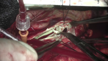 First, Dr. Gaudiani cannulated the femoral vein and performed a full sternotomy. He then placed a right superior pulmonary vein vent and cannulated the superior vena cava (SVC) and aorta with antegrade del Nido cardioplegia.