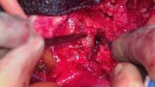 After sternotomy, heparanization and cannulation, dissection exposed the ascending aorta, the arch, and its branches. The brachiocephalic trunk and the right common carotid were controlled. We could not find the left subclavian artery. The aneurysm was located distal to the right common carotid artery.