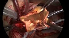 Methods: An internal bicuspid annuloplasty ring was developed with circular base geometry and two 10-15 degree outwardly flaring subcommissural posts, positioned 180 degrees opposite on the circumference. This video shows the technique of surgical ring placement into the valve annulus, and bicuspid leaflet repair, in two patients with simple bicuspid defects. The first patient had a Sievers Type 0 valve with R-L fusion, no cleft, and only moderate aortic insufficiency. The valve was repaired during grafting of an ascending aortic aneurysm. The second patient had a Sievers Type I valve with R-L fusion, a moderate cleft, and severe aortic insufficiency. Both were repaired with #23 ring annuloplasties and standard leaflet reconstruction techniques.