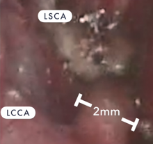 The patient was a 4-day-old, 3.95 kg boy with an antenatal diagnosis of double outlet right ventricle with subpulmonary ventricular septal defect (Taussig-Bing anomaly), d-malposed great vessels (side-by-side orientation, aortic valve is rightward and slightly anterior to the pulmonary artery), and severely hypoplastic aortic arch (segment between left common carotid and left subclavian arteries). Essentially, a single coronary arose from the right posterior sinus with an acute marginal artery arising alone from the left anterior sinus.