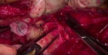 The aorta was cross-clamped distally a few centimeters below the left renal artery. The celiac, superior mesenteric, and right and left renal arteries were divided and cannulated. Selective perfusion with whole blood was instituted at the rate of 250 mL/min. A 22 mm graft with three previously constructed branches corresponding to the celiac, SMA, and right renal arteries was anastomosed to the descending thoracic aorta in a continuous fashion. The branches were then anastomosed to the corresponding arteries. The distal anastomosis was completed to the infrarenal aorta, the graft was de-aired, the pump stopped, and flow re-established to the branches. The left renal artery was then anastomosed via a separate graft in an end-to-side fashion to the main graft and flow was re-established.