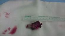 The patient was placed in the right lateral decubitus position, and double lumen intubation was performed to achieve unilateral ventilation. A port incision was placed behind the posterior axillary line at the level of the seventh interspace to accommodate a 5 mm thoracoscope. The borders of the rib lesion were marked with needles, and two additional ports were placed 2.5 cm anterior and posterior to the lesion under thoracoscopic control. The parietal pleura inferior to the fifth rib was opened with electrocautery. Periosteal tissues at the proximal and distal ends of the fifth rib were dissected. The intercostal vessels were coagulated and cut with electrocautery. The lower margin of the fifth rib was looped with a Gigli saw, and the fifth rib was transected. The upper margin of the fifth rib was transected in the same manner. A 5 cm segment of the rib was resected, and a bag was inserted into the thoracic cavity through the port for removal of the rib segment. The operative port incisions were sutured and one chest tube was inserted via the camera port wound. The total surgery time was 50 minutes.