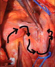 A median sternotomy was performed, and the pericardium was opened to encounter the proximal right coronary aneurysm. The superior vena cava was looped to allow for exclusion of venous return. Direct cannulation of the aorta and percutaneous access of the femoral vein were performed to place the patient on cardiopulmonary bypass. Further dissection revealed the giant aneurysm between the aorta, right pulmonary artery, and superior vena cava, with an apparent arteriovenous fistula between the right coronary aneurysm and the right atrium. The shunted blood flow coursed from the aorta, to the right coronary aneurysm, to the right atrium.