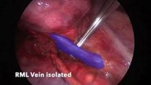 The anterior oblique fissure was identified and isolated with a vascular sling. It was divided with staples. Another interlobar lymph node was identified and dissected. The right middle lobe was retracted upward, exposing the RML vein. With blunt dissection, we went around and isolated the RML vein. The vein was divided with a vascular stapler.