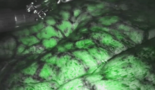 The authors then proceeded to the perfusion assessment. The da Vinci Firefly system involves the injection of indocyanine green (ICG) tracer into the blood, which is then detected using near-infrared imaging. Dilute 1 ampoule (25 mg) of Verdye (ICG) with 10 ml water for injection to give a 2.5 mg/ml solution. Administer the ICG in a 3 ml bolus and repeat as necessary, to an upper limit of 0.3 mg/kg. ICG is confined to the vascular system, has a half-life of 3-4 minutes, and is eliminated by the liver (1). The system allows for real-time intraoperative assessment of pulmonary perfusion, with ICG detectable in the lung parenchyma within seconds following injection, thus guiding resection. In this patient, the lingua demonstrated comparatively good perfusion, and therefore the targeted resection avoided this area entirely.