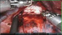 A 62-year-old man presented with complaints of chronic cough and hemoptysis. Chest x-ray revealed a right lung mass. PET CT showed an FDG avid 5.3 cm tumor within the right middle lobe invading the upper lobe. On biopsy, this was found to be adenocarcinoma. Preoperative staging workup revealed no distant metastases and after comprehensive preoperative evaluation, the patient was deemed a surgical candidate and brought for elective robotic resection. Intraoperatively, the large right middle lobe neoplasm was identified with extension across the minor fissure. The decision was made to proceed with bilobectomy. The dissection was complicated by atypical vascular anatomy and concerns for pericardial invasion. Robotic bilobectomy with pericardial resection and reconstruction was completed. The use of robotic technology has facilitated identification of the structures, dissection, and conduct of this complex operation. The procedure was complicated by postoperative bleeding and hemothorax, requiring return to the OR. Upon VATS exploration, the bleeding was localized to the apical parietal pleura, believed to be the result of CT trauma unrelated to the surgical dissection. The patient underwent an uneventful recovery and was discharged home on postoperative day six. Final pathology revealed pT3N1 adenocarcinoma with a 5.9 cm tumor and one intrapulmonary nodal metastasis.