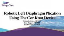 This video is a description of a novel technique using an automatic suture device (Cor-Knot) in robotic-assisted diaphragm plication. The slides go through the indications, OR set-up, operative steps, pitfalls, and pertinent points. The video is a demonstration of this technique.