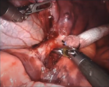 The patient was a 43-year-old woman with a body mass index of 49.5 who was incidentally found to have a left lower lobe, PET positive, 2 cm, suspicious lesion. Her metastatic workup did not show evidence of distal disease. Ports were placed in the eighth intercostal space with the anterior port always placed one intercostal space more superior than compared to lobectomy. After port placement, the dissection was started by taking down the pulmonary ligament. The pleura was opened over the posterior surface of the lung up to the apex, and the lymph node dissection was performed.