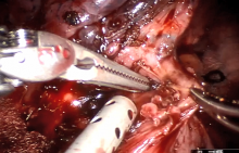 This video demonstrates the resection of a proximal typical carcinoid tumor of the singular bronchus that required the bronchus to be cut and then sutured closed. Since suturing was required, the author used the Si Robotic system, which is ideally suited for suturing. The distal lingular tissue had also been chronically collapsed, so there were also quite a few adhesions, which were dealt with by bipolar diathermy and then stapling the lung tissue off the pulmonary artery. The authors used the Cerfolio-based robotic technique (1).