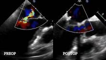 Seven months after surgery, the patient was doing well. The echocardiography showed an effective mitral valve repair without mitral regurgitation or stenosis (gradients were stable, EF 50%).