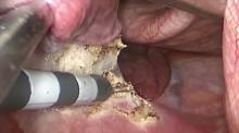 A 54-year-old-woman presented with recent weight loss and hemoptysis. A chest CT scan revealed a left lung central tumor. Bronchoscopy confirmed an infiltrating lesion at the level of interlobar carina, and biopsy revealed primary squamous cell carcinoma. Clinical staging with TEP scan was cT3N2M0 (T3 because complete lung atelectasis and N2 because pulmonary window adenopathy). To complete the staging, the authors performed a mediastinoscopy. It was negative at station 4 right and left, and station 7. The patient was offered left pneumonectomy by single-port approach.