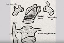 This patient presented with a severe hypoplastic aorta, ductal stenting, left subclavian artery arising from the coarctation site, and aberrant right subclavian artery as a fourth supra-aortic vessel coming off the descending aorta. The brachiocephalic artery had been previously handled (neck ECMO) and a Norwood procedure was ruled out due to poor ejection fraction.