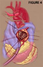 Exposure is obtained by elevating the valve annulus with sutures at each commissure and pledgeted 4-0 polypropylene sutures in the right and non-coronary cusps (Figure 4).