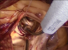6. Retrograde cardioplegia was repeated during the preparation of the valve, and the 19 mm Intuity valve was parachuted. The operating surgeons checked the correct position of the valve before inflating the balloon. A quick inspection of the inflow frame was done in order to confirm that it was completely under the native annulus. Before removing the clamp, it is advisable to place the wire in the right ventricle and the drainage tube.