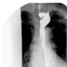 | Figure 4. One year postoperative esophagram showing residual proximal dilatation, but improved transit of contrast through the cervical esophagogastric anastomosis. |