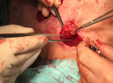 Under general anesthesia, the patient was placed in the standard supine decubitus position. The authors performed a cervical transverse skin incision of about 4 cm. Subsequently, they performed a pectoral reverse muscle-cutaneous flap with supraclavicular tunneling. The tracheal defect was attached and covered with the flap, which was sutured to the tracheal wall with interrupted sutures. The operation took 100 minutes with insignificant blood loss. The intraoperative FBS showed a good tracheal lumen without stenosis and the patient was extubated immediately. The postoperative course was uneventful.