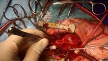 Since the hybrid procedure is not possible unless the pulmonary venous return is corrected, it was decided to modify the hybrid procedure by inserting a graft into the PDA instead of stenting the PDA (1). The mediastinum was reached through the previous incision. The innominate artery was cannulated with an 8F cannula. A bicaval cannulation was performed. Previously banded pulmonary arteries were dissected and hanged with silastic tapes after initiating a bypass. The procedure was performed under 32 degrees Celsius normothermia. Pledgeted traction sutures were placed at the apex of the heart. The heart was pulled towards the patient's right shoulder. The posterior pericardium was opened parallel to the left phrenic nerve. Pericardial traction sutures were placed. A descending aorta dissection was completed and freed from the esophagus (2). Purse sutures were placed in the descending aorta and cannulation was completed by using a side clamp.