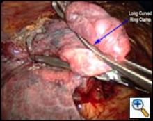 Once the working incision has been made and the lung collapsed, further pressure on the upper lobe parenchyma with a tonsil sponge on a long curved ring clamp ensures complete collapse of the upper lobe. The mediastinal pleura around the upper pulmonary hilum is mobilized sharply or with cautery (Video 2). This allows for increased mobility of the upper lobe. A long curved ring clamp (Figure 3) introduced through the working incision is used to grasp the upper lobe at its apex and retract the lobe superiorly and laterally. This allows the surgeon to inspect the upper lobe and decide the position of the line of resection.