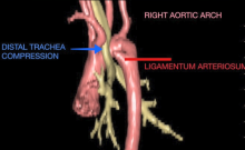 Vascular ring is a congenital anomaly of the aortic arch that compresses the esophagus and/or trachea. It can be asymptomatic for life and not require any intervention. On the contrary, there are some vascular rings that are associated with respiratory (frequent infections, stridor, cough, distress) and esophageal (difficulty feeding, gastroesophageal reflux, dysphagia) symptoms. The most common vascular rings are double aortic arch and right aortic arch with left ligamentum arteriosum.