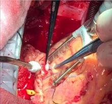 A 62-year-old male was admitted in cardiogenic shock. He had previously received a dual chamber pacemaker for complete heart block. A coronary angiogram revealed triple vessel disease. A transthoracic echo showed that the patient had severe ischemic mitral regurgitation (coaptation depth of more than 10 mm), and severe left ventricle dysfunction (EF 25%). He was stabilized on IABP and was taken into surgery. He had varicose veins on both legs. He underwent total arterial complete revascularization with bilateral internal mammary artery and mitral valve replacement using a 27 mm mosaic valve. Both internal mammary arteries were dissected, and LIMA RIMA Y was made using 8-0 prolene sutures. A pump-assisted CABG was performed with LIMA to D1, LAD, and RIMA to OM1 and RCA.