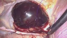 A nylon bag was put into thoracic cavity via 12mm trocar, preparation for tumor harvest. After the tumor was located, the tumor was meticulously and completely resected from the interatrial septal attachment, delivered into the nylon bag,