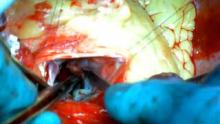 This is a 52-year-old man with hypertrophic obstructive cardiomyopathy (HOCM). He has been on maximal medical therapy with combination of Beta blockers and calcium channel blockers with progression of his symptoms especially during exertion. Preoperative evaluation included transthoracic echocardiography and cardiac MRI for risk stratification. Studies showed severe septal hypertrophy especially at the basal levels. At rest, the the peak gradient across the left ventricular outflow tract was 59 mm Hg which increased to 115 mm Hg with Valsalva maneuver. There was systolic anterior motion (SAM) of the anterior mitral valve leaflet and posteriorly directed mitral regurgitation jet.