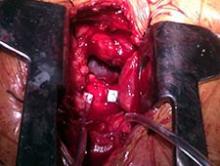 Nevertheless, he continued to experience angina that was associated with increasing dyspnea at mild effort (NYHA II-III/IV). The patient was assessed by the Heart Team of our hospital which concluded that he had an unacceptable risk for conventional aortic valve replacement (STS morbidity and mortality risk of 28%). Instead, we opted in this case for the transaortic approach because of his peripheral vascular disease and in an attempt to avoid ventricular injury.