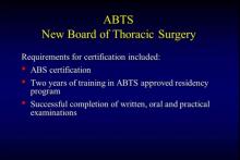 In this video, William Baumgartner, Executive Director of the American Board of Thoracic Surgery (ABTS), shares an update on ABTS activities. Dr. Baumgartner describes the current ABTS certification process, explains maintenance of certification, and summarizes the types and numbers of cardiothoracic surgery residency programs.