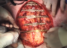 The patient was taken to the operating room, positioned supine, and prepared for surgery from the neck to pelvis. A small midline laparotomy was performed, and an omental flap was harvested for inlay above the heart. Bilateral pectoralis major muscle advancement flaps were mobilized as an overlay. Rib plating was performed with Synthes® plates. A cryogenically preserved allogenic bone graft was used to bridge the defect between the rib edges for long-term structural support. Cryogenically-preserved allogenic bone grafts are stored in the bone bank at the authors’ institution. They acts as a scaffolding to allow bone in-growth over time. Osteoprogenitor cells migrate from omental fat, leading to bone formation within the graft. Large experiences have been published in orthopedics using this graft type for filling bony defects and restoring skeletal continuity. This graft can be used in thoracic surgery, and its applications should be further explored.