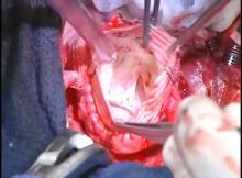 A 34 mm Dacron conduit was interposed between the sinotubular junction and the distal ascending aorta. The patient was weaned from cardiopulmonary bypass after a cross-clamp time of 31 minutes, with trivial neo-aortic valve regurgitation. By the following morning, the patient was on minimal ventilator settings, neurologically intact, and had excellent hemodynamic performance and cardiac function. The patient was then returned to the operating room, where a VSRR was performed. The VSRR yielded trivial neo-aortic valve regurgitation at completion of the procedure.