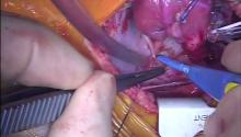 Cooling started on the ECMO circuit while the baby was transferred from the PICU. The chest was opened by the standard midline approach, a full dose of Heparin (100 u/kg) was administered, and ECMO was converted to cardiopulmonary bypass via the neck cannulae. Cooling was continued to 25ºc. The aorta was cross-clamped and the heart was arrested with cold blood antegrade cardioplegia. The ventricular mass was reflected into the right pleura, exposing the posterior pericardium.